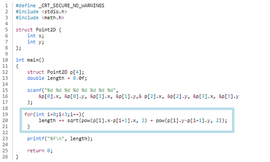 <문제>표준 입력으로 x, y 좌표 4개가 입력되어 Point2D 구조체 배열에 저장됩니다. 여기서 점 4개는 첫 번째 점부터 마지막 점까지 순서대로 이어져 있습니다. 다음 소스 코드를 완성하여 첫 번째 점부터 마지막 점까지 연결된 선의 길이가 출력되게 만드세요.