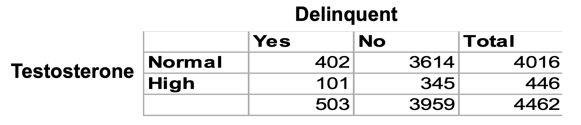 테스토스테론 수준과 대출 연체에 대한 연구에서 나온 다음의 데이터를 사용해서 odds, odds ratio를 계산해보겠다.