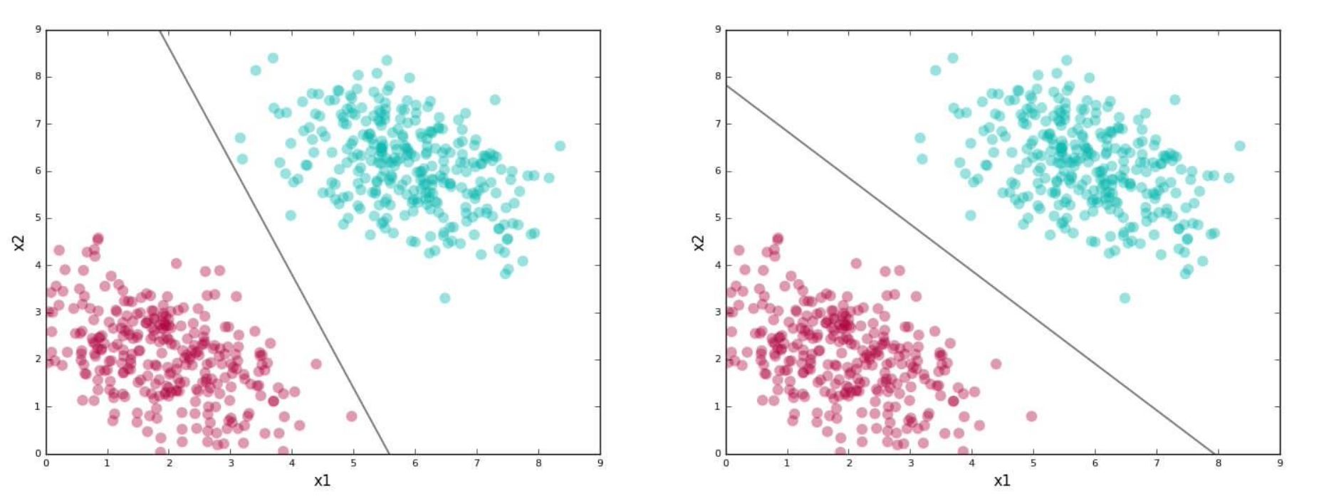 빨간색과 초록색을 분리하는 선은 무수히 많지만 그 중 두개를 보여주자면 다음과 같다. 그리고 각 선은 classifier 또는 separating boundary 라고 한다. 아래 첫 번째 그림의 classifier은 "skewed"되어있다. 두 번째 그림의 classifier가 테스트 데이터 세트에 대해 정확하게 예측할 가능성이 더 높다.