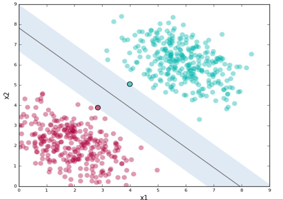 -support vector: 분리선을 식별하는 가장 가까운 데이터 점 (아래 그림에서 가장자리가 검은색인 데이터 점 두 개)