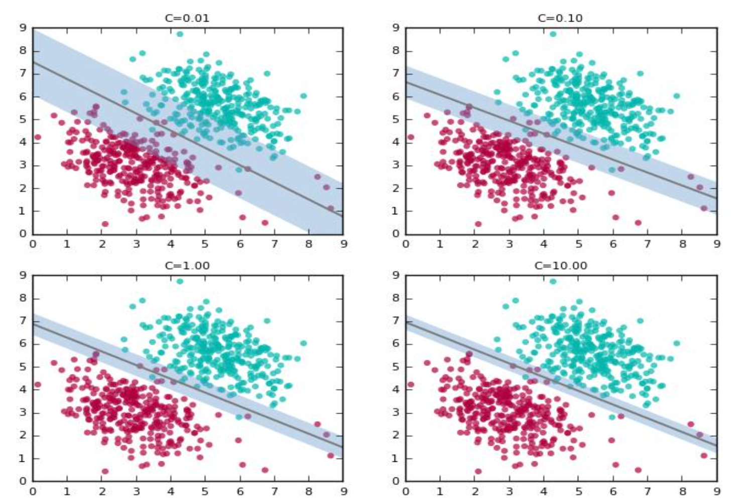 ◼ C의 높은 값은 분류 오류에 대한 높은 패널티를 의미한다.