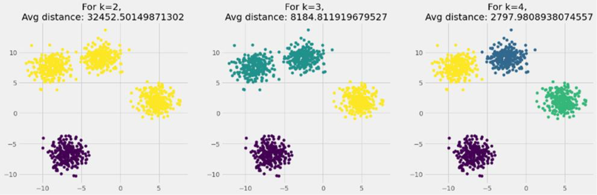 ◼ k=2, 3과 4 사이에서 평균 거리가 급격히 떨어진다.