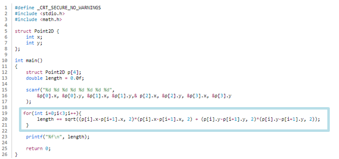 <문제>표준 입력으로 x, y 좌표 4개가 입력되어 Point2D 구조체 배열에 저장됩니다. 여기서 점 4개는 첫 번째 점부터 마지막 점까지 순서대로 이어져 있습니다. 다음 소스 코드를 완성하여 첫 번째 점부터 마지막 점까지 연결된 선의 길이가 출력되게 만드세요.