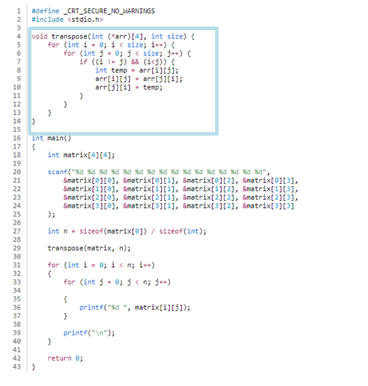 <문제>표준 입력으로 정수 16개가 입력됩니다. 다음 소스 코드를 완성하여 행렬의 전치행렬이 출력되게 만드세요.