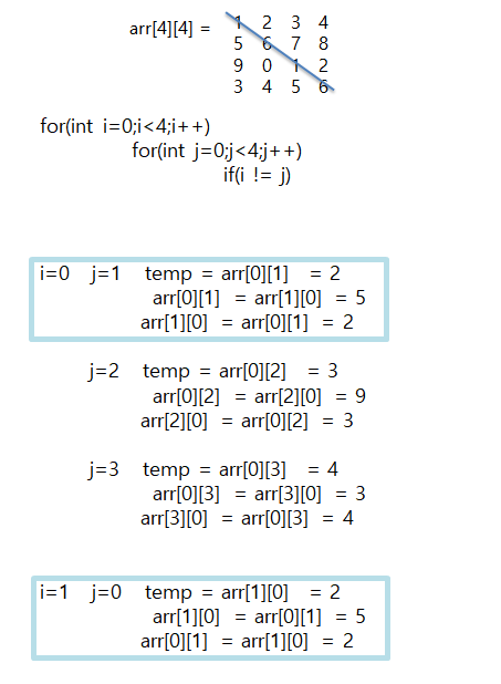 주대각선의 수를 기준으로 값을 뒤집는 것이므로 arr[i][j]에서 i와 j의 값이 같지 않을 때만 arr[i][j]의 값과 arr[j][i]의 값을 바꿔 주어야 합니다.