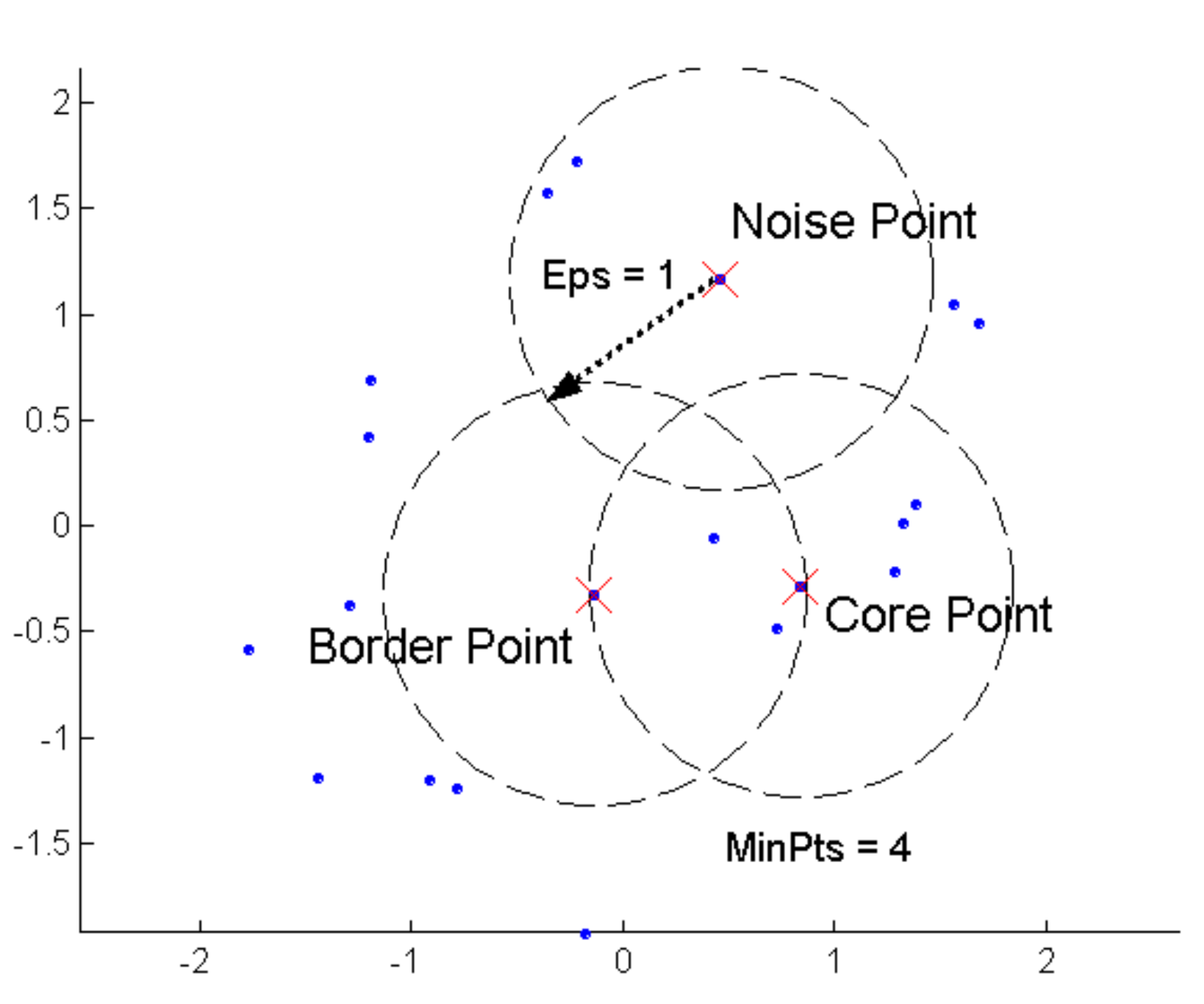 ◼ border point: Eps 내에서 MinPts 객체보다 적지만 core point 근처에 있는 경우