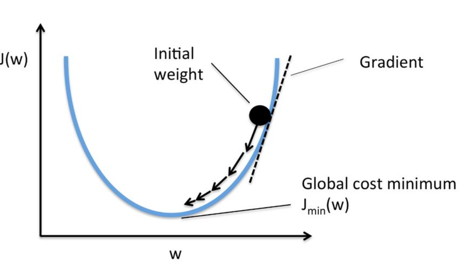 목표는 J(W)를 최소화하는 값 W 집합을 찾는 것이다. 비용 함수에 대한 랜덤 초기 가중치(W)로 시작하여 global한 최소값에 도달할 때까지 점진적으로 더 나은 가중치를 계속 찾는다. 주어진 가중치 집합을 개선하기 위해 현재 가중치와 유사한 가중치에 대한 비용 함수의 가치를 파악하려고 한다. 그리고 나서 우리는 비용 함수를 줄이는 방향으로 나아간다. 이 단계를 수천 번 반복함으로써 비용 함수를 지속적으로 최소화할 것이다.