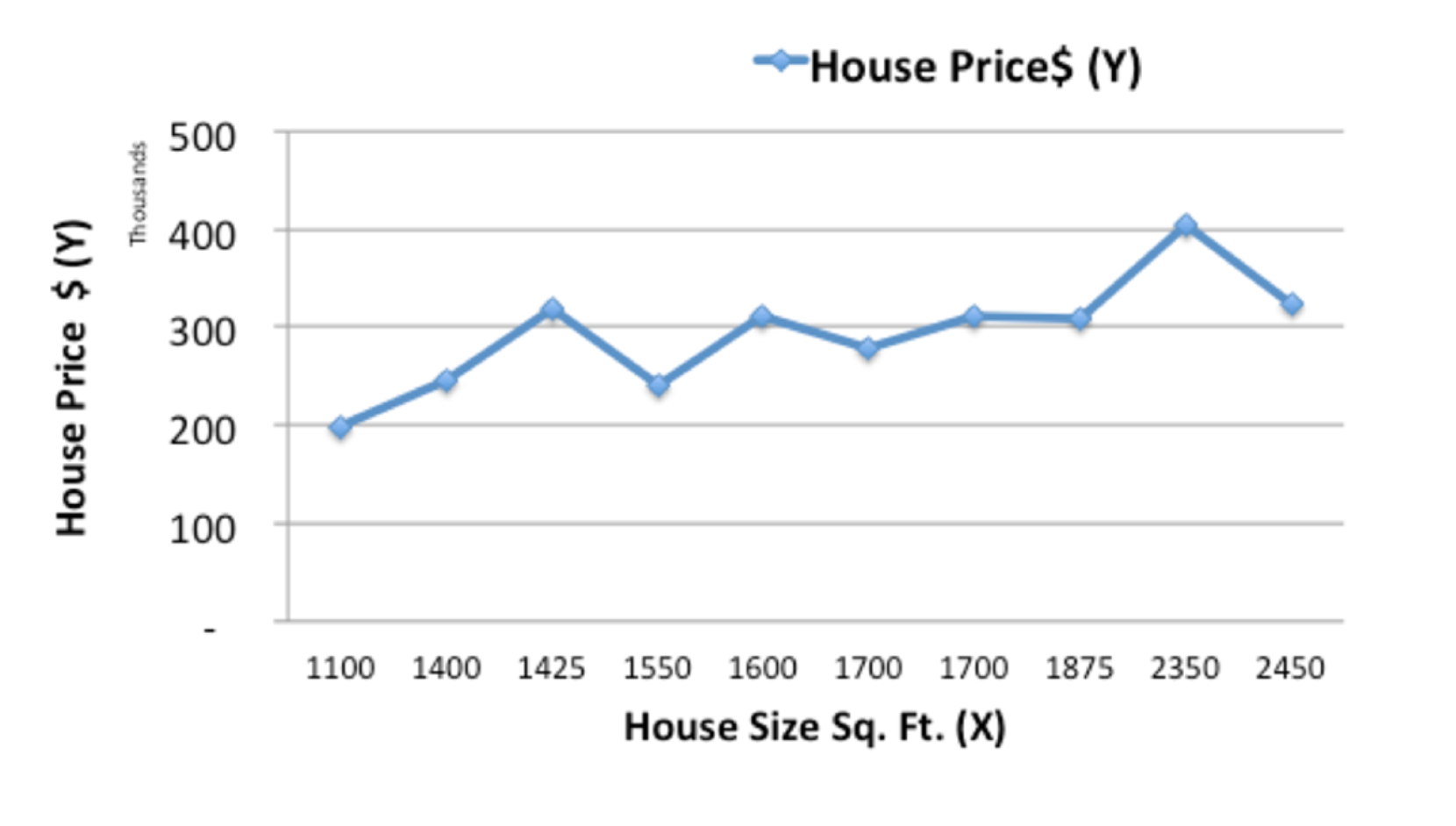 주택 규모를 기준으로 새 주택 가격을 예측하는 모델 구축하려고 아래의 과거 주택 데이터셋을 사용할 것이다. 새 집의 경우 크기(X)가 주어지면 가격(Y)은 얼마인지 예측하려고 한다.