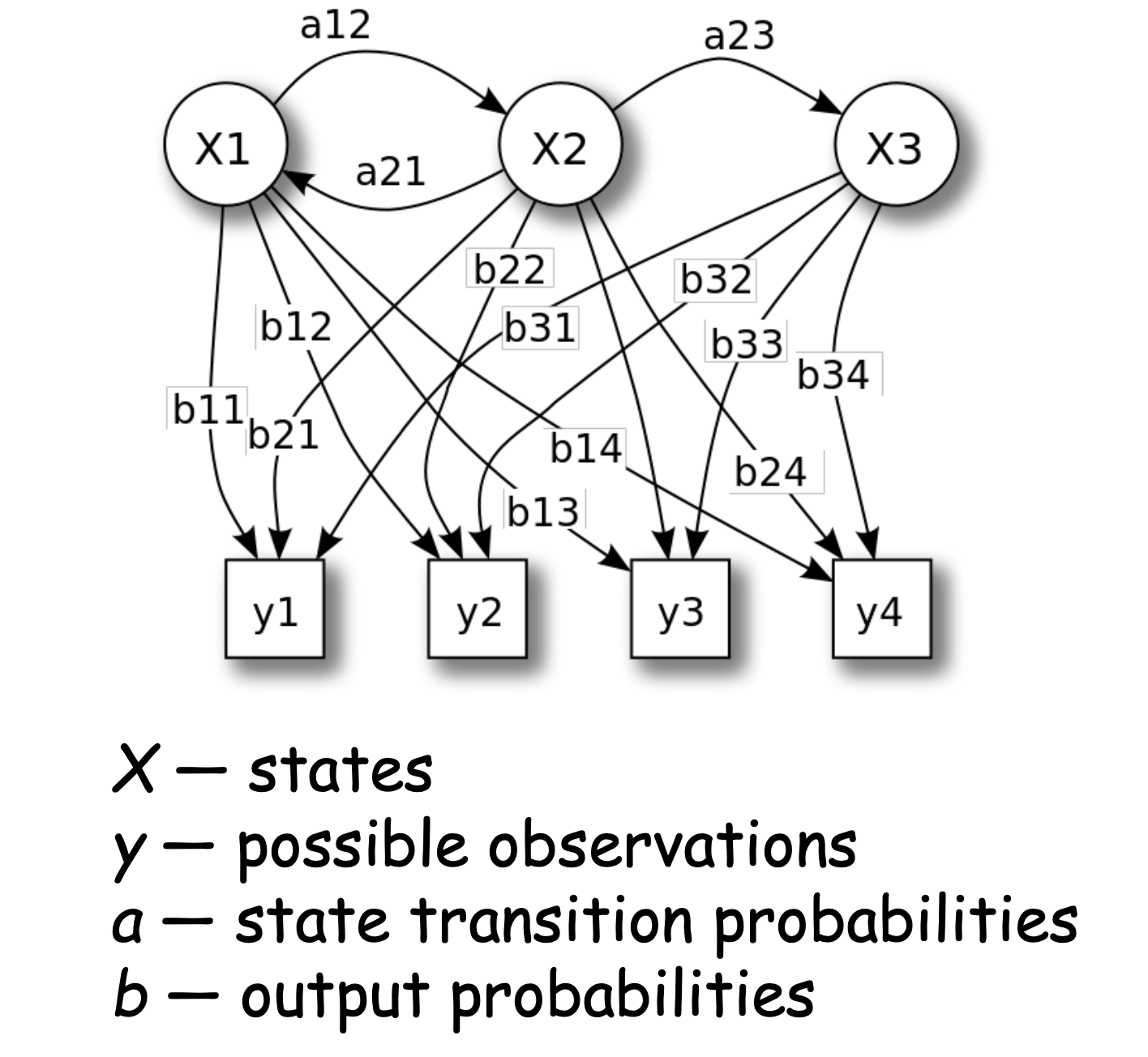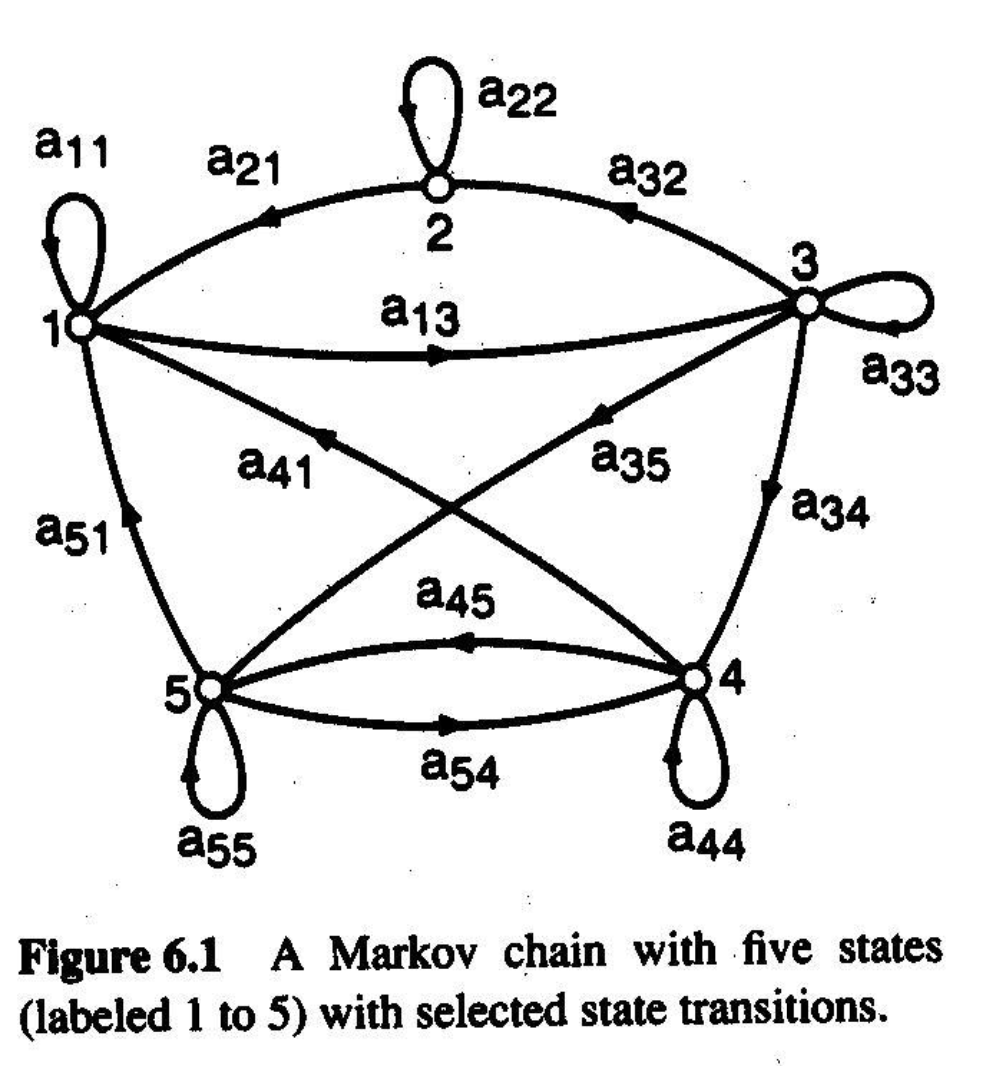 ◼ 위 그림에서 각 aij는 상태 i에서 상태 j로 이동할 확률을 나타낸다.