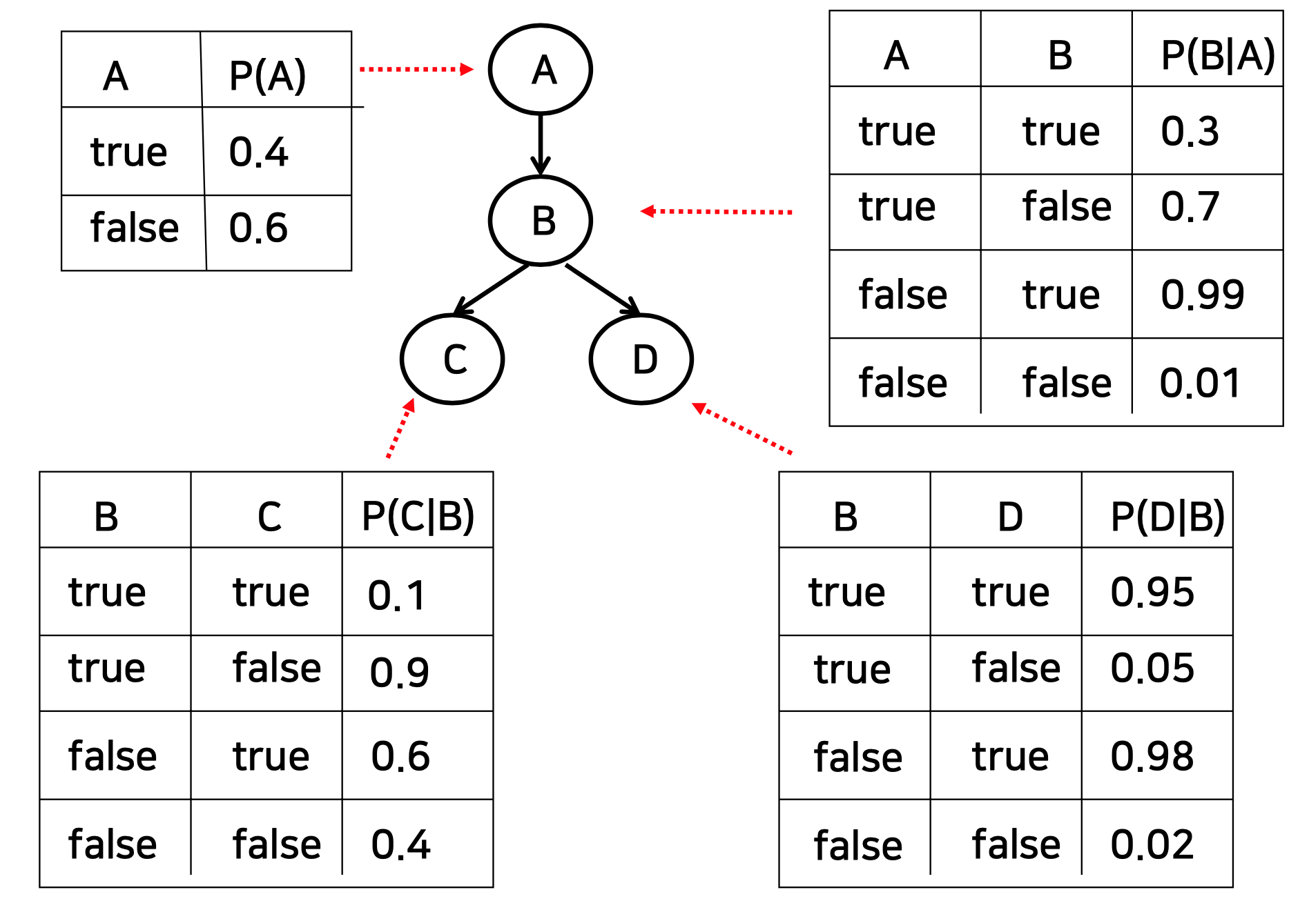 ◼ 베이지안 네트워크에 대한 일련의 조건부 확률 테이블이 있다.