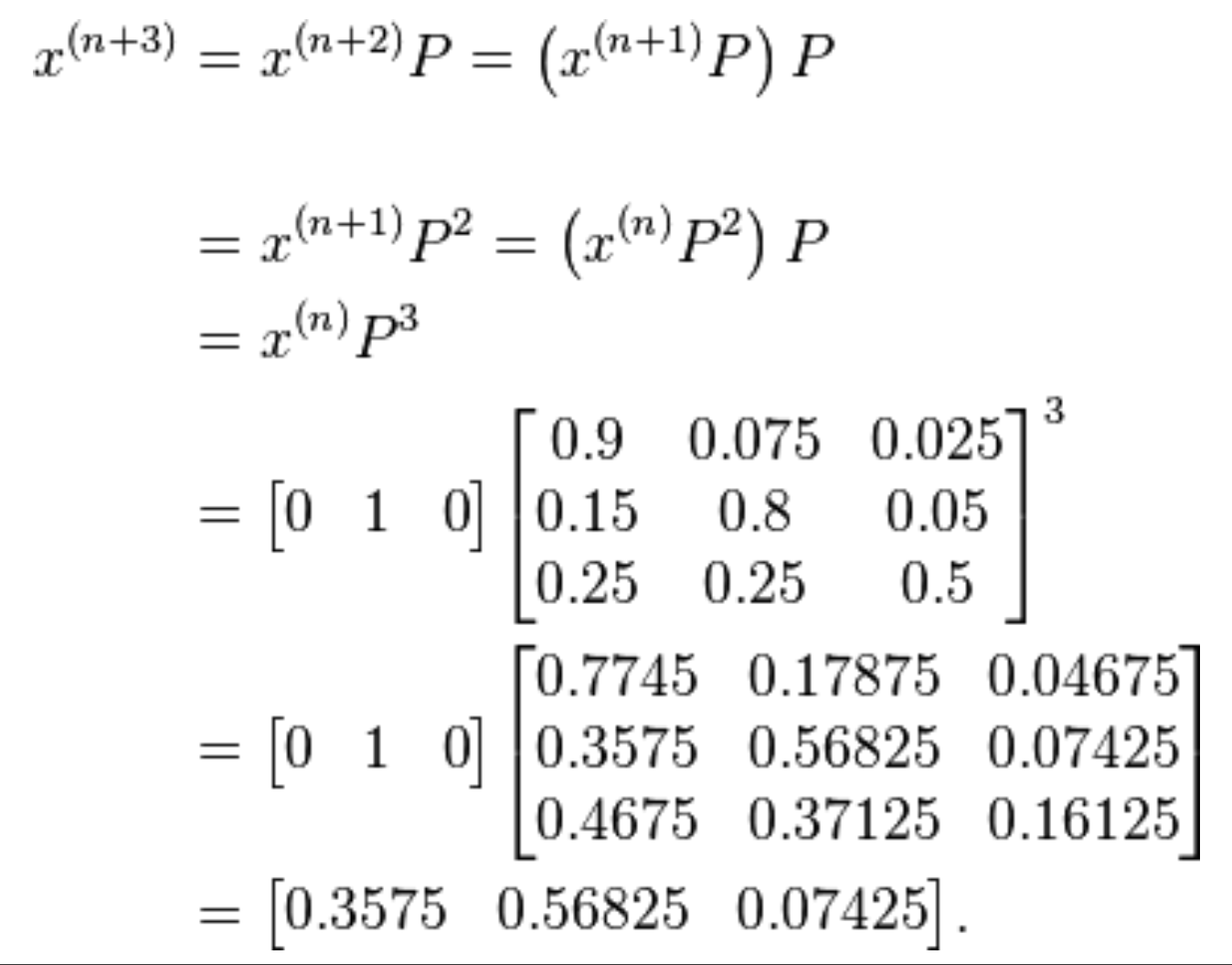 만약 시간 n에서 시스템이 상태 2(bear)에 있다면, 세 시간 후에 시간 n + 3에서 확률 분포는 다음과 같다.