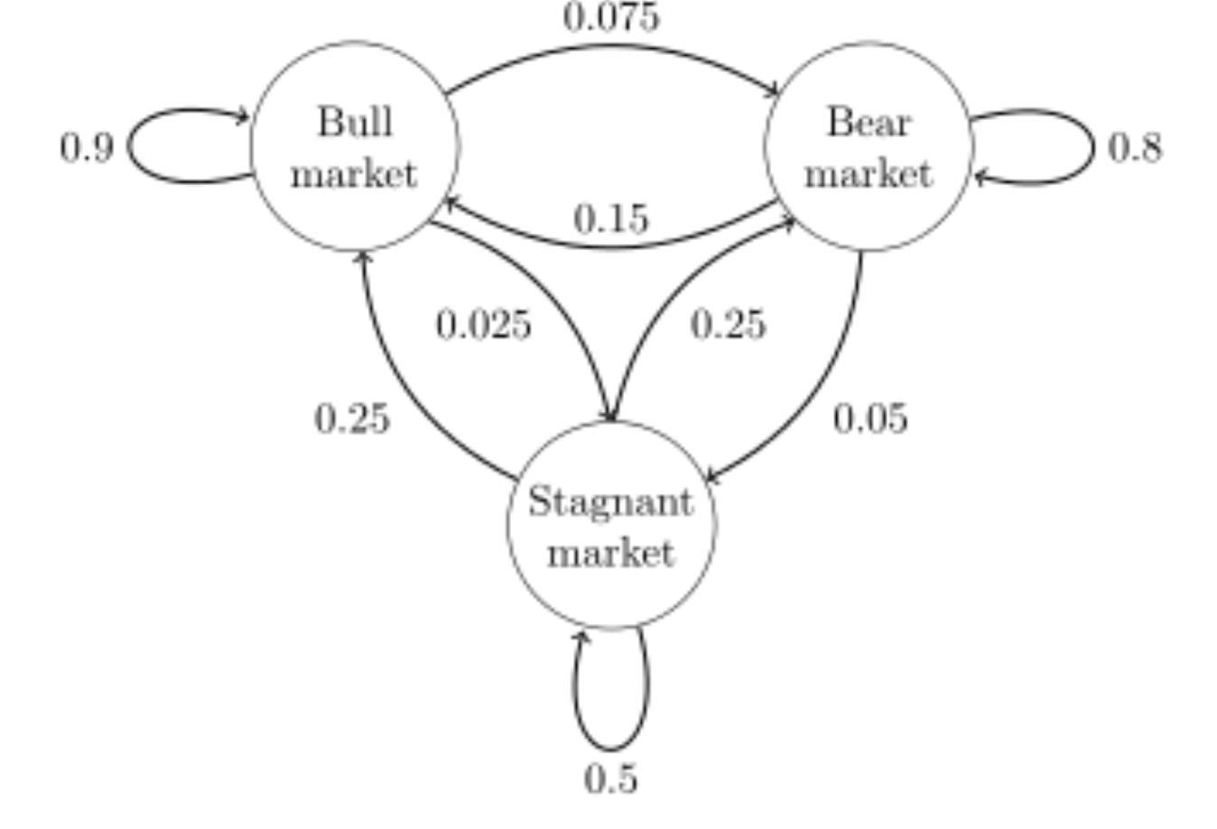 강세(bull) 주간은 90%, 약세(bear) 주간은 7.5%, 정체(stagnant) 주간은 2.5%이다. {1 = bull, 2 = bear, 3 = stagnant}