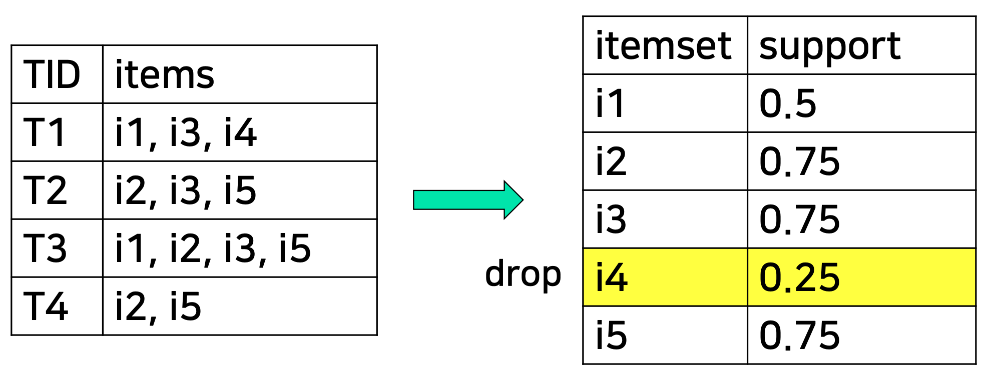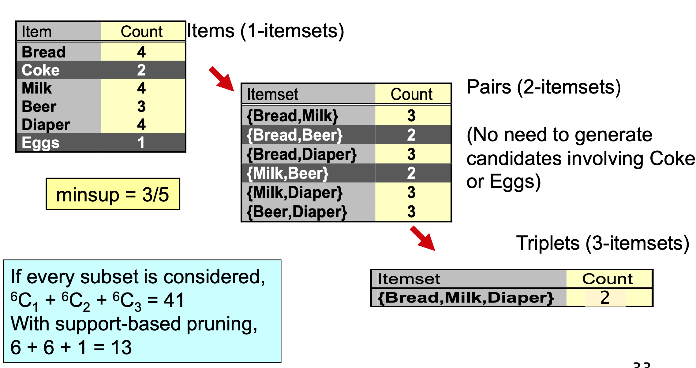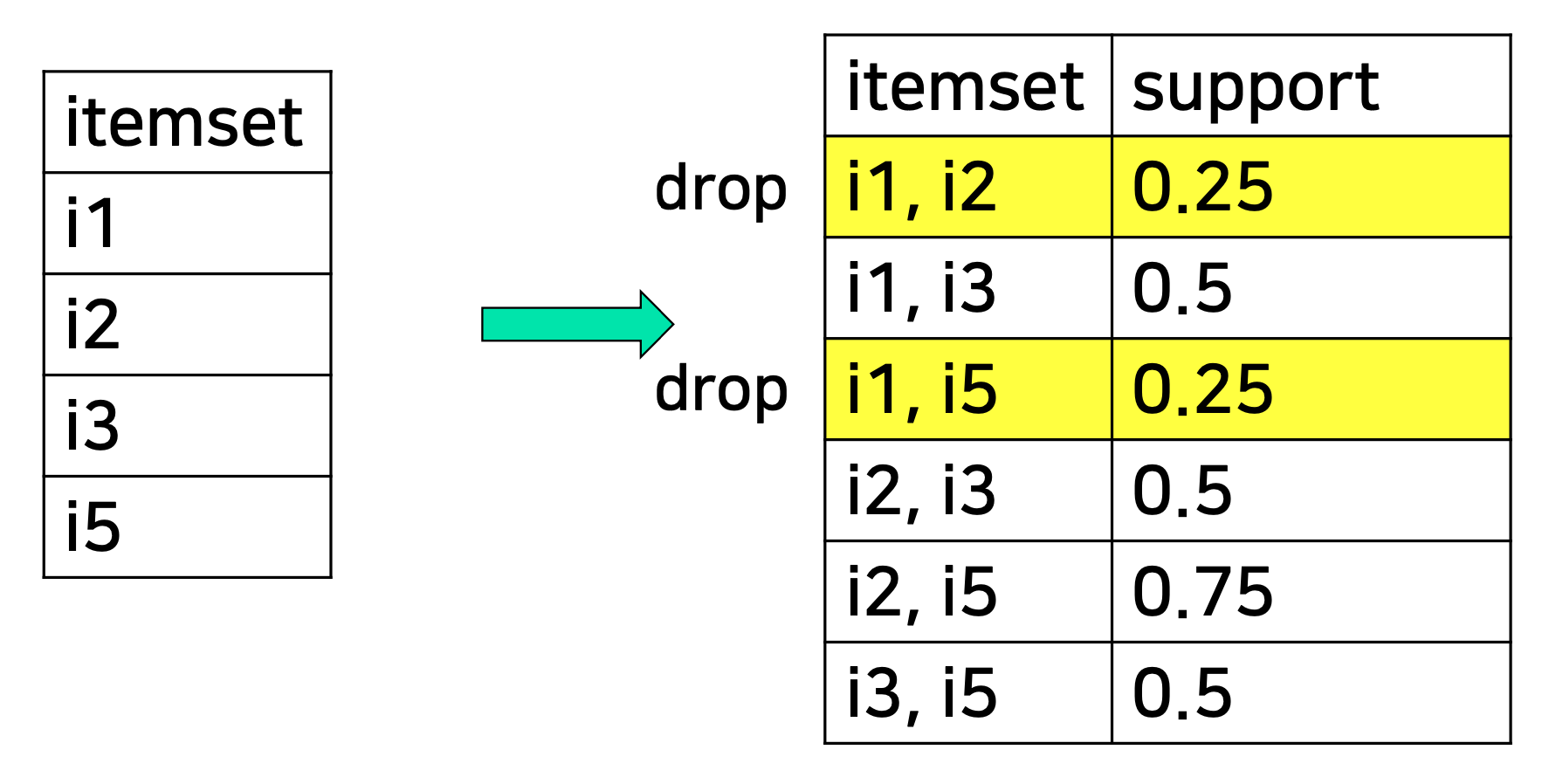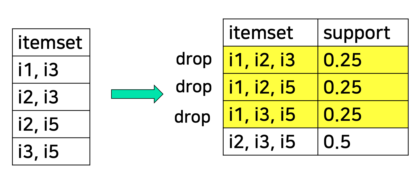 k가 증가하면 support가 감소하므로 생성할 후보 항목 집합의 수를 줄일 수 있다.