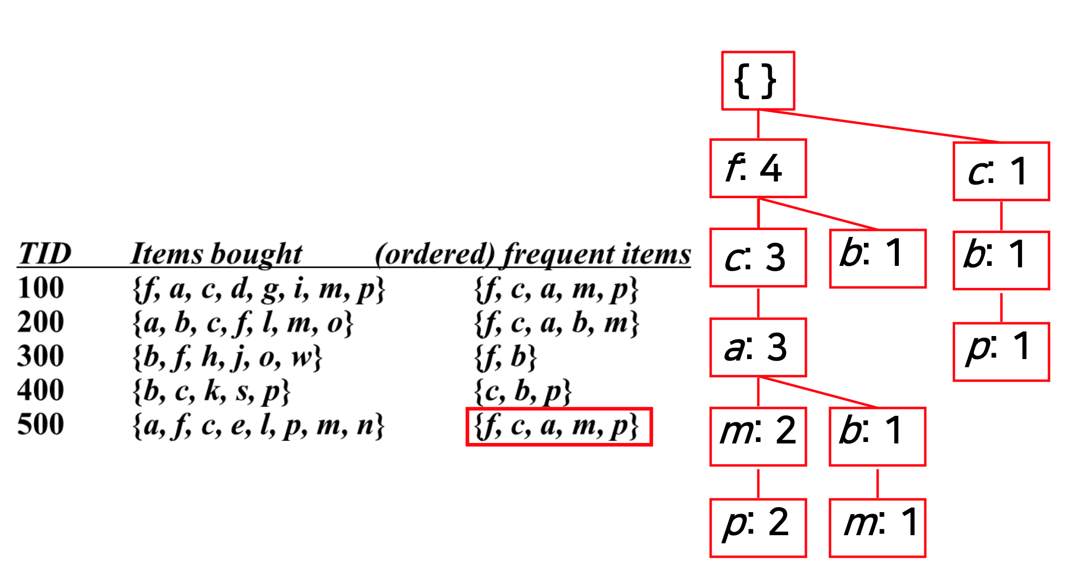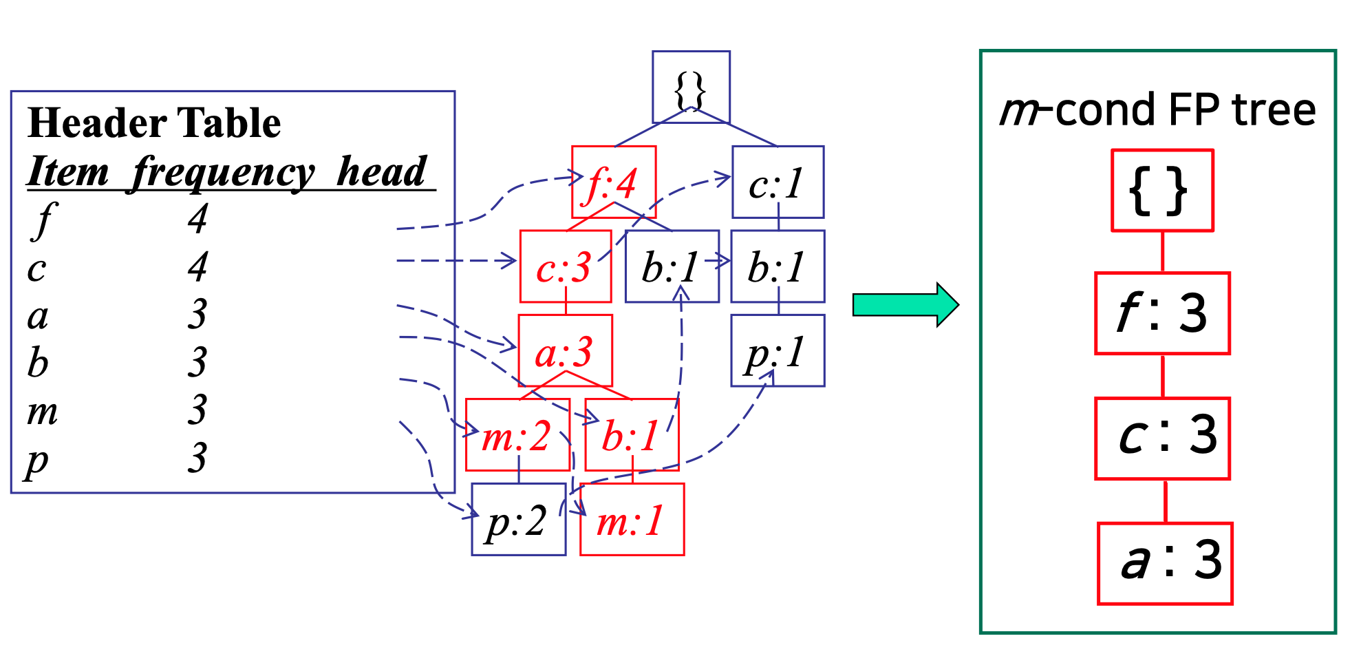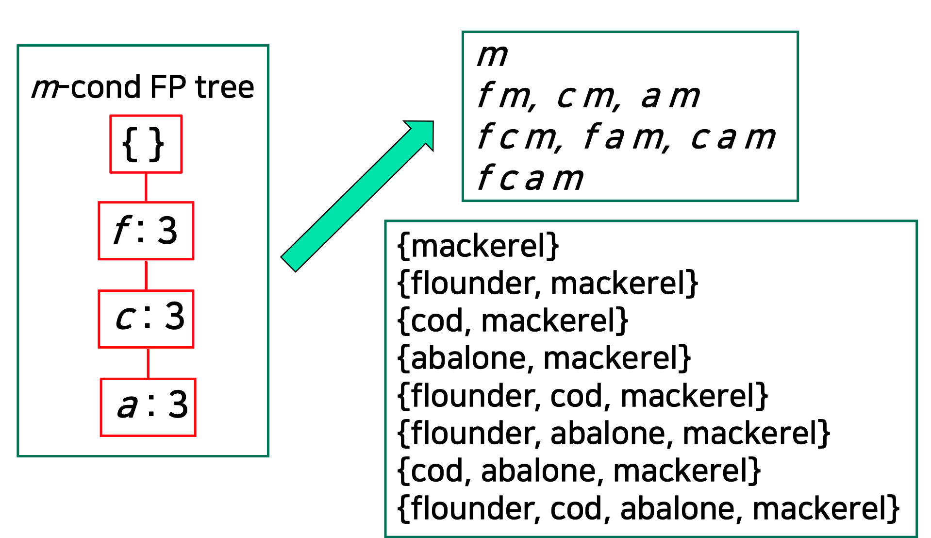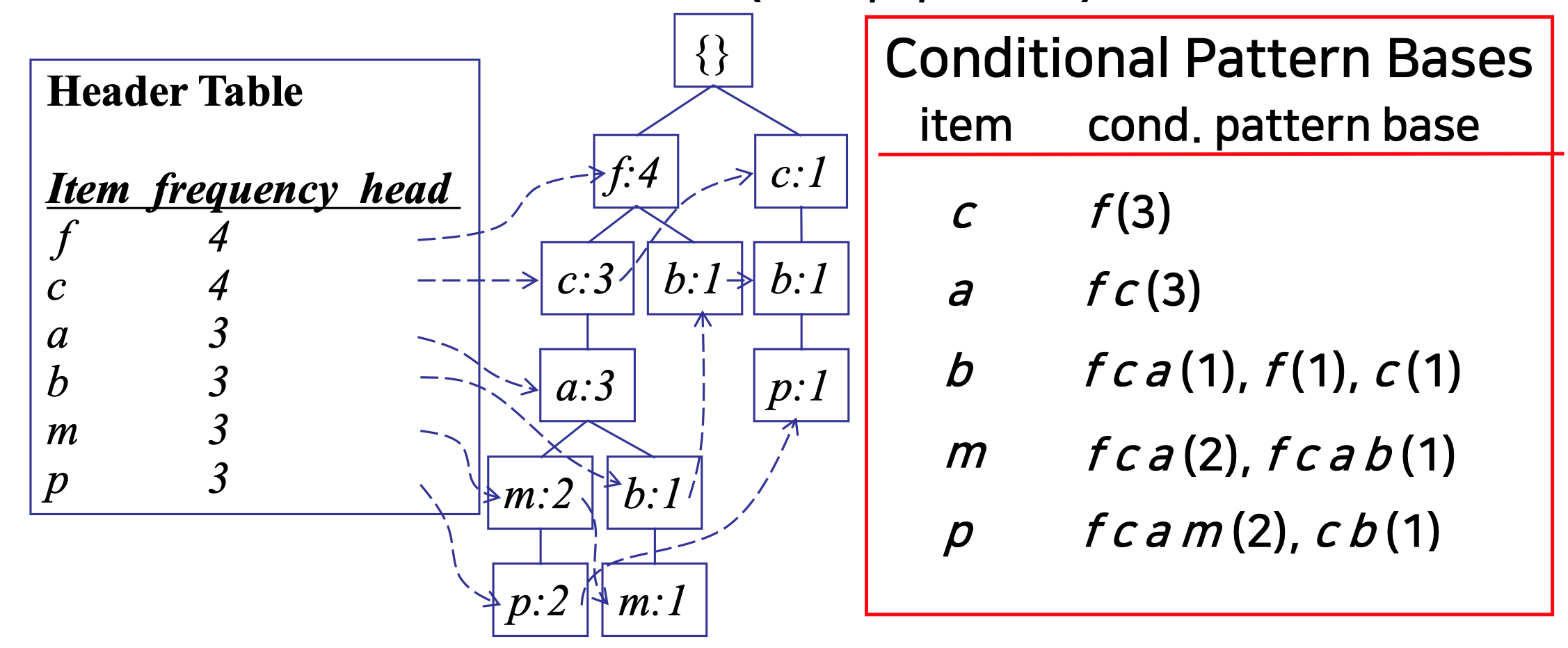 ◼ 데이터베이스가 FP 트리/조건부 FP 트리로 압축됨