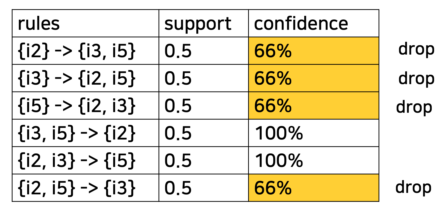 confidence test를 적용하여 최종적으로 association rules set을 찾는다.