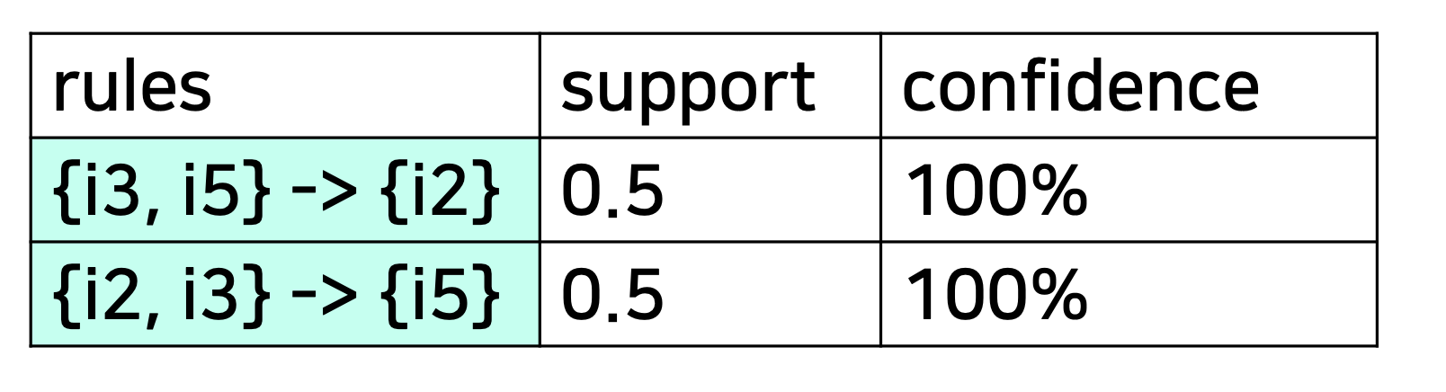아래와 같은 transaction dataset에서 association rule을 찾아보겠다. (support threshold=50%, confidence threshold=80%)
