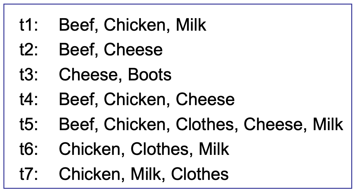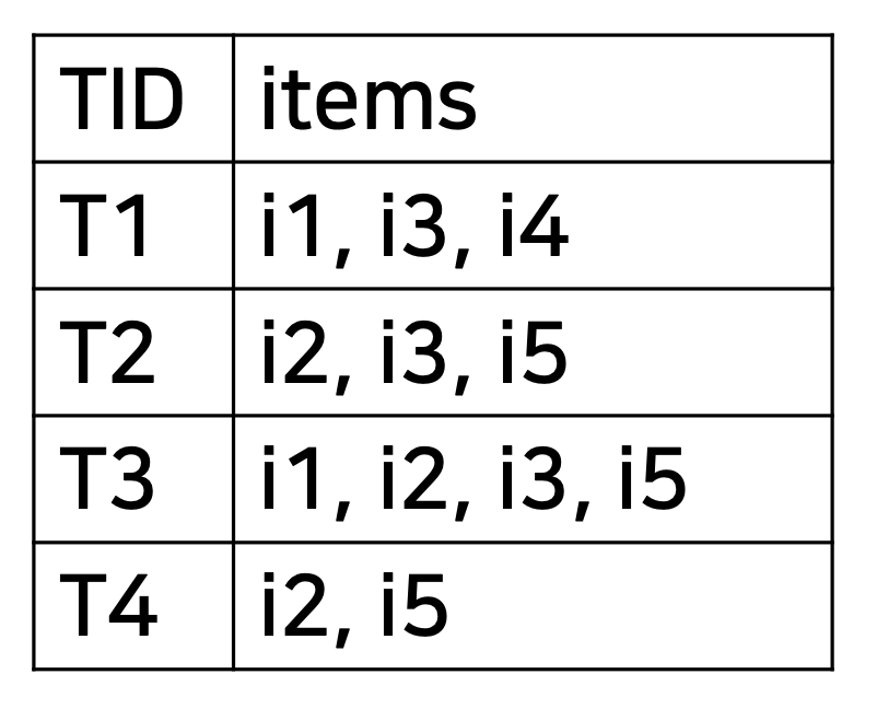 ◼ transaction dataset: 트랜잭션의 집합