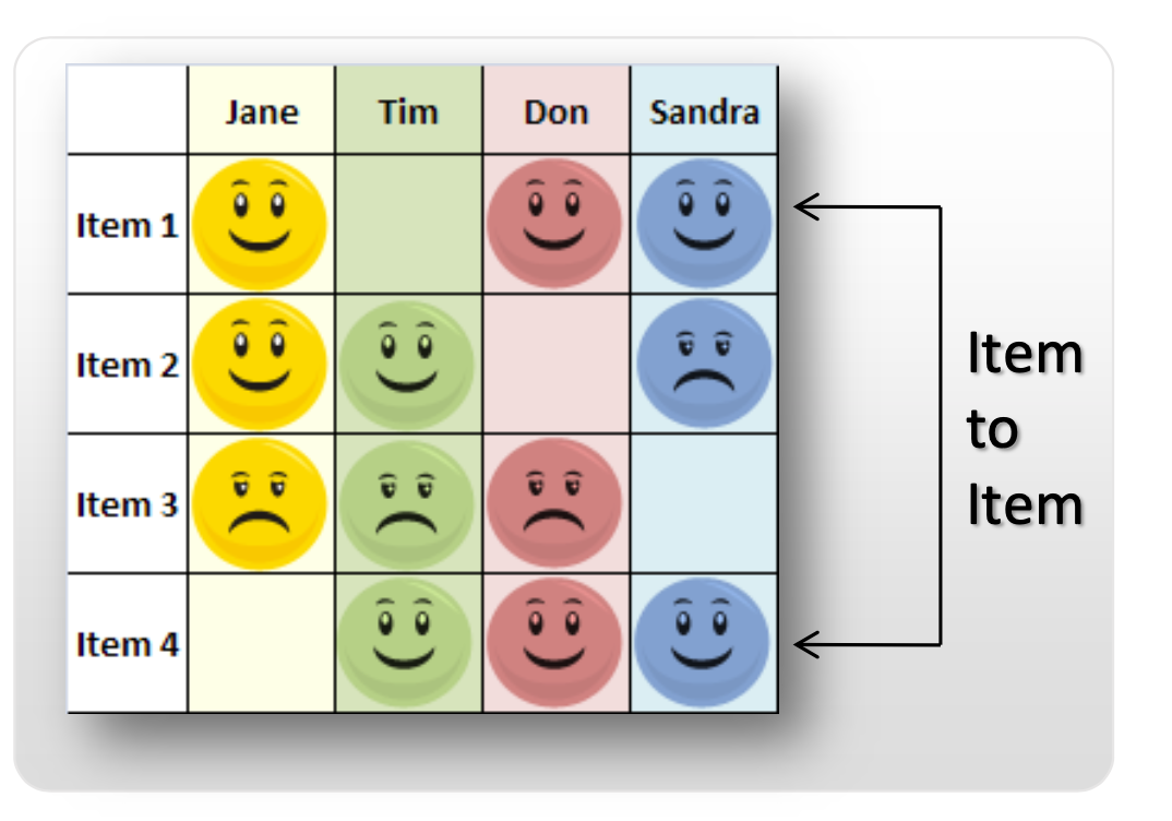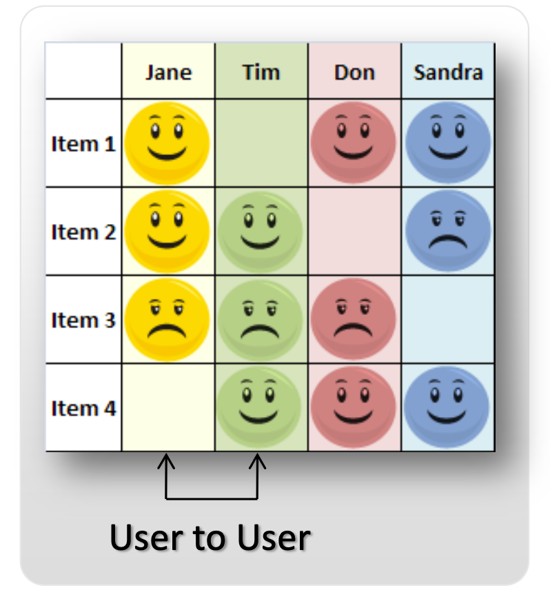 아래 그림에서 Jane과 Tim은 둘 다 항목 2를 좋아했고 항목 3을 싫어했다. 그들이 비슷한 선호를 가지고 있다고 가정한고 항목 1을 Tim에게 좋은 추천 항목으로 만든다.