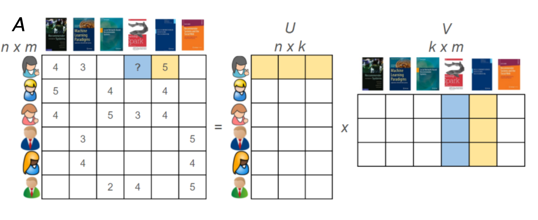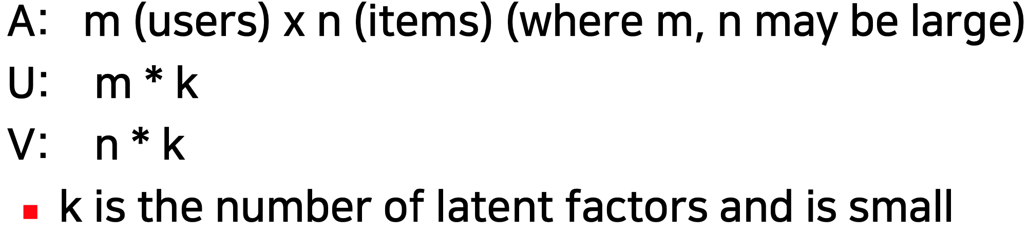 ◼ 즉, 등급 행렬 A는 A의 차원보다 차원이 훨씬 작은 행렬 U와 V로 계수된다.
