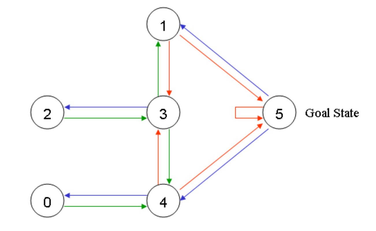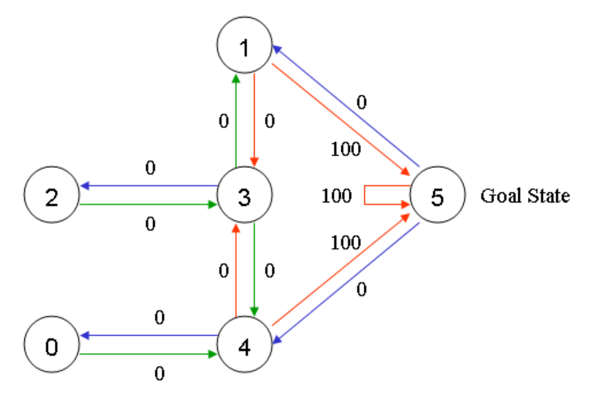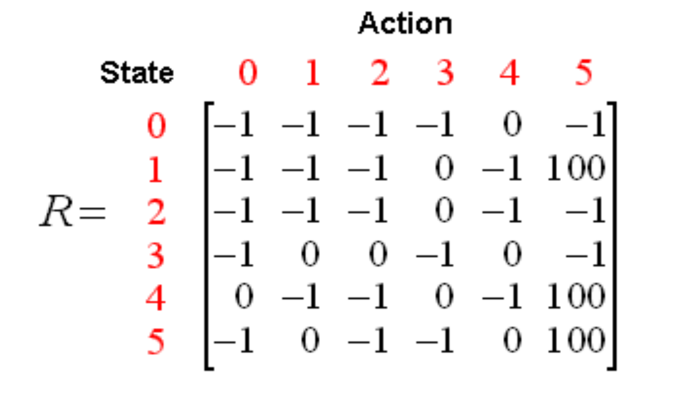 reward값을 사용한 상태 다이어그램의 행렬 표현은 아래와 같다. (R(보상) 행렬의 "-1"s는 null 값을 나타낸다.)