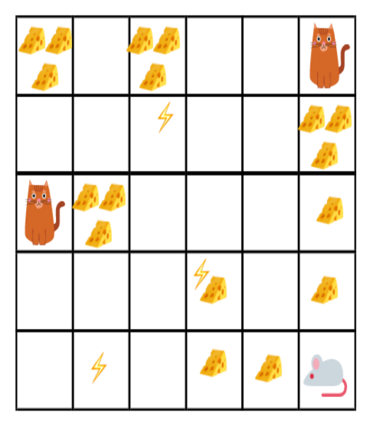 아래의 예시 게임에서, 우리의 로봇 마우스는 많은 양의 작은 치즈(개당 +0.5)를 얻을 수 있다. 하지만 미로의 꼭대기에는 엄청난 양의 치즈(+100)가 있다. 따라서, 우리가 (즉, 가장 가까운 보상에 집중하는) 착취만 한다면, 우리의 로봇 쥐는 절대로 치즈의 큰 액수에 도달하지 못할 것이다. 하지만 로봇 쥐가 약간의 탐험을 한다면, 큰 보상, 즉 큰 치즈를 찾을 수 있다.