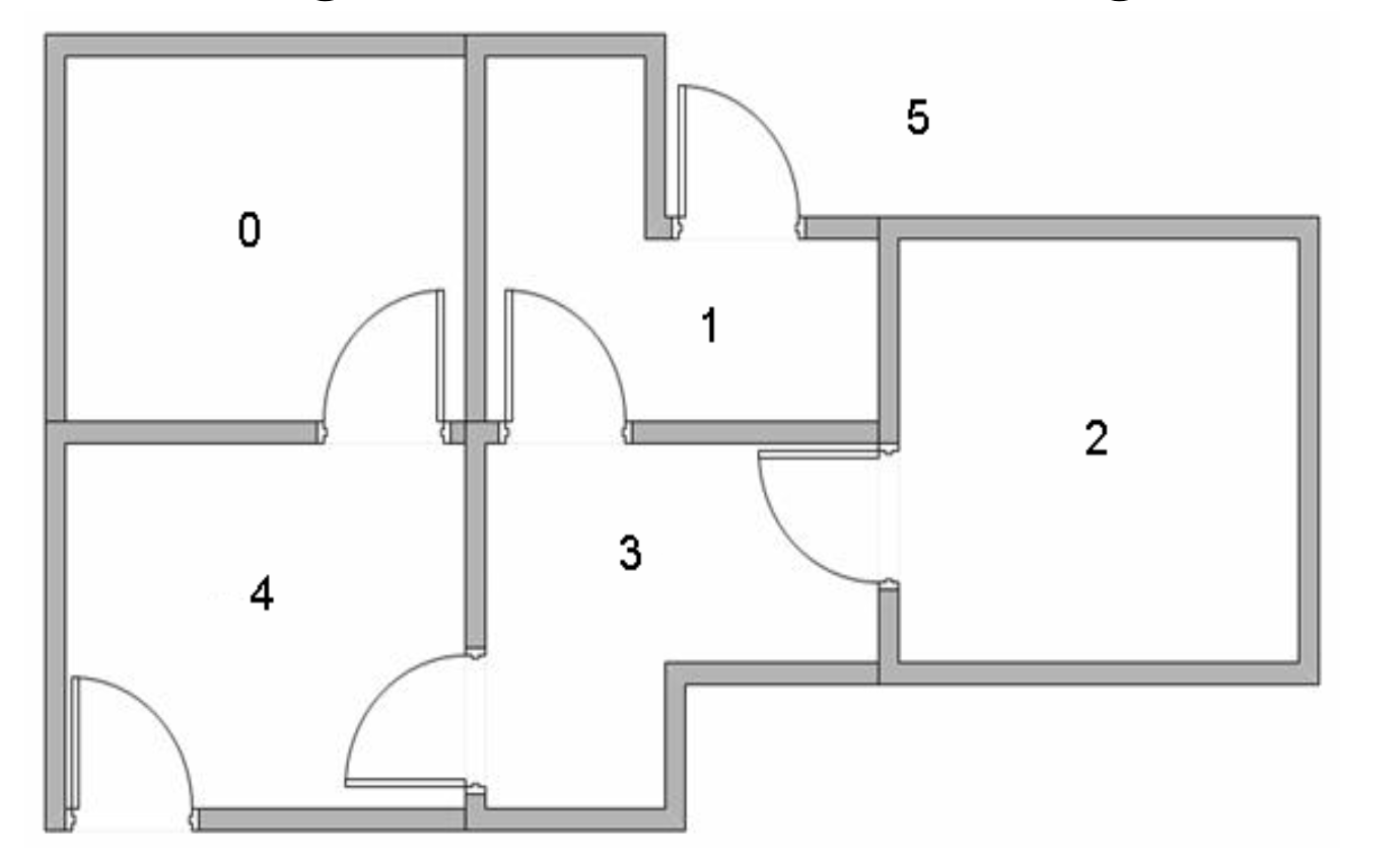 문으로 연결된 건물의 5개의 방이 있고 건물 밖에는 큰 방 하나(5호실)가 있다.