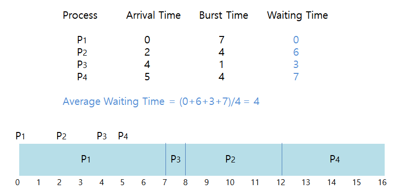 스케줄링 기준: cpu 이용 시간이 가장 짧은 프로세스 먼저
