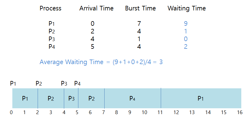 단점: cpu이용시간이 긴 프로세스들은 짧은 cpu이용시간을 가진 프로세스가 계속 새로 진입한다면 우선순위가 계속 밀리게 되어서 영원히 실행되지 않는 starvation현상이 나타날 수 있다.