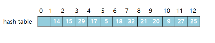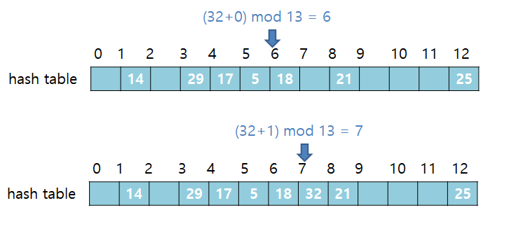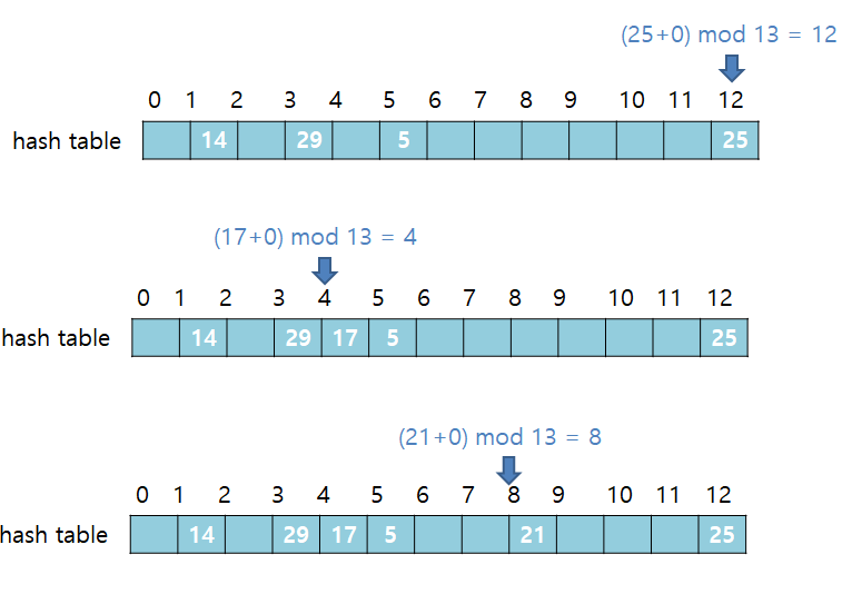 선형 프로빙(linear probing)의 단점: primary clusturing (한 번 충돌 발생 시 그 부분에서 계속 충돌 발생)
