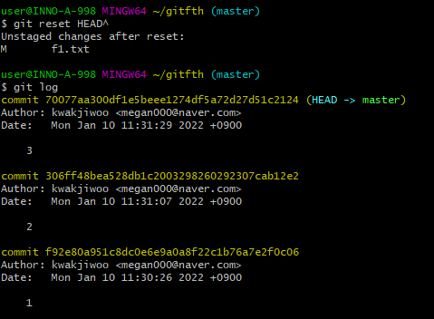 git reset HEAD^: 가장 최근의 커밋 삭제하기