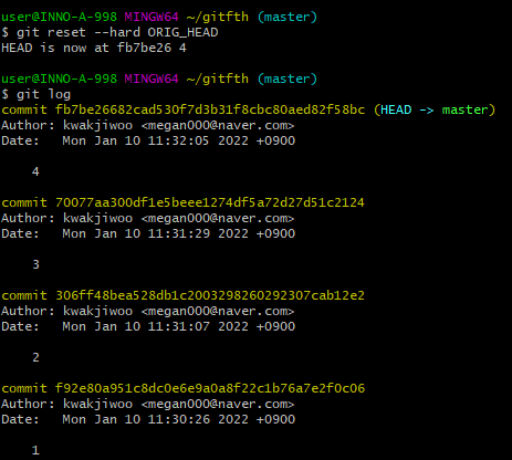 git reset --hard ORIG_HEAD 수행 후 커밋 "4"의 내용이 다시 나타난 것을 볼 수 있다.