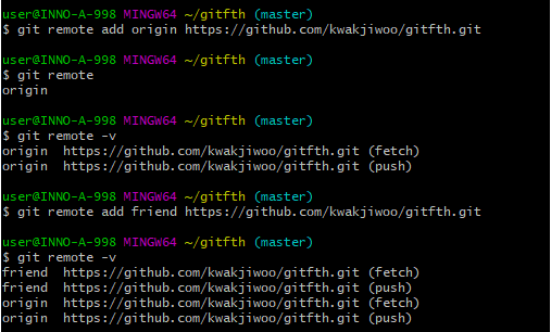 git remote add 단축이름 주소: github의 repository 주소를 단축해서 부를 이름을 지정하고 자신의 컴퓨터에 추가한다.