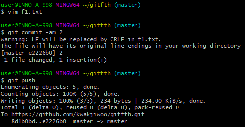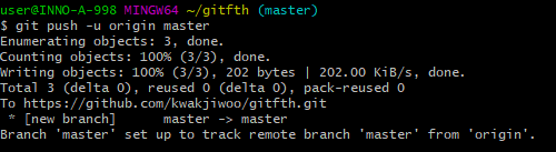 git push -u 단축이름 브렌치이름: 해당 branch의 파일을 단축이름으로 불리는 주소에 저장한다.