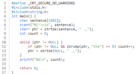 <문제>표준 입력으로 길이 1,000 이하의 문자열이 입력됩니다. 입력된 문자열에서 "the"의 개수를 출력하는 프로그램을 만드세요(scanf 함수 호출 전에 문자열을 출력하면 안 됩니다). 단, 모든 문자가 소문자인 "the"만 찾으면 되며 "them", "there", "their" 등은 포함하지 않아야 합니다.