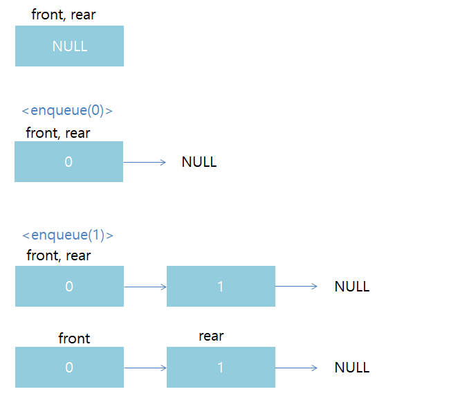 하지만 큐에 이미 값이 저장되어있을 때는 rear가 새로운 값을 저장하고 있어야 하기 때문에, 위에서 만든 임시변수의 next는 기존에 저장된 rear을 가리키게 만든 후에 rear가 새로운 값을 저장하고 있는 임시변수가 되게 만들어야 한다.