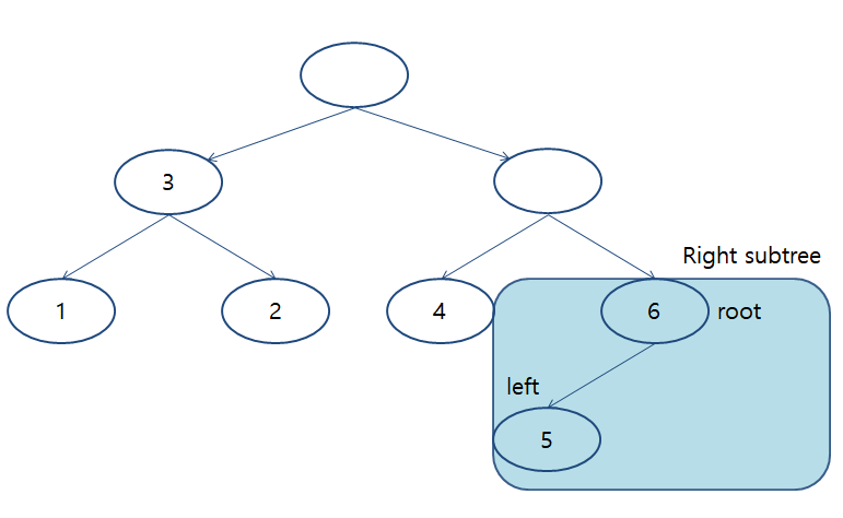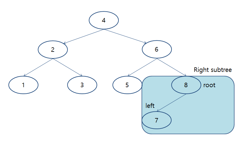 오른쪽 subtree에서 가장 왼쪽 노드가 탐색되고 그다음 root노드가 탐색된다.