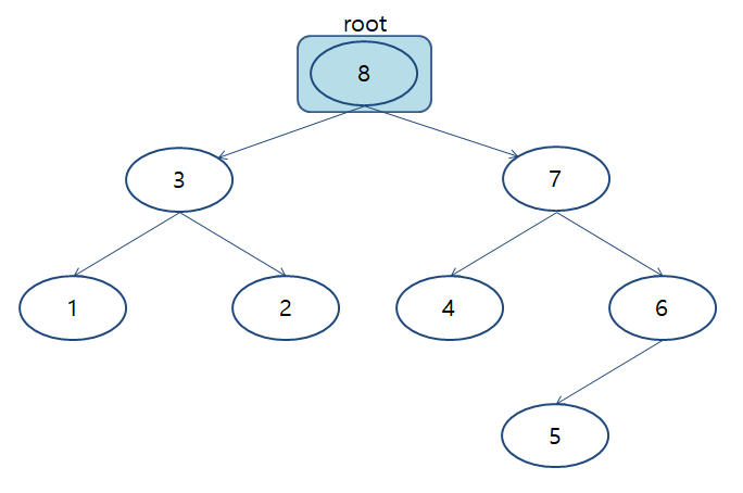 왼쪽의 subtree의 탐색이 모두 끝났기 때문에 이제 root 노드가 탐색된다.